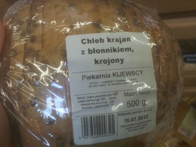 Nie byłoby w nim nic szczególnego, gdyby nie fakt, że każdy chleb zawiera błonnik :) ponieważ źródłem tej substancji są między innymi produkty zbożowe. To tak samo, jakby chwalić się, że oto mamy szynkę z mięsem wieprzowym w składzie ;) (choć w dzisiejszych czasach różnie z tym mięskiem bywa). Wygląda dość ładnie, gdyby nie ta tajemnicza mieszanka eco-trade. Są to zapewne polepszacze – w tym przypadku „eco" zdecydowanie bardziej kojarzy się z „ekonomiczny” zamiast „ekologiczny”. Plus dla piekarni za pomysłowość, minus za wprowadzanie w błąd klienta.