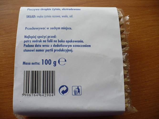 Zatrzymajmy się jeszcze na koniec na chwilkę nad substytutem chleba, jakim jest pieczywo chrupkie. Wśród całego gąszczu różnego rodzaju chlebów, jedynie (co zaskakujące) najtańszy z nich charakteryzował się trzyskładnikową zawartością, a mianowicie:Gdybyśmy miały wybierać wśród tych wszystkich, szumnie reklamowanych, skusiłybyśmy się jednak na ten niepozorny i najtańszy z nich, ze względów oczywistych: