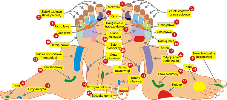 - Masaż zawsze zaczynamy od lewej nogi (po stronie serca) i od śródstopia. U niektórych osób strefy refleksyjne mogą być lekko przesunięte. Nie należy się tym martwić. Ważne jest, by masować bolesne miejsce na stopie.